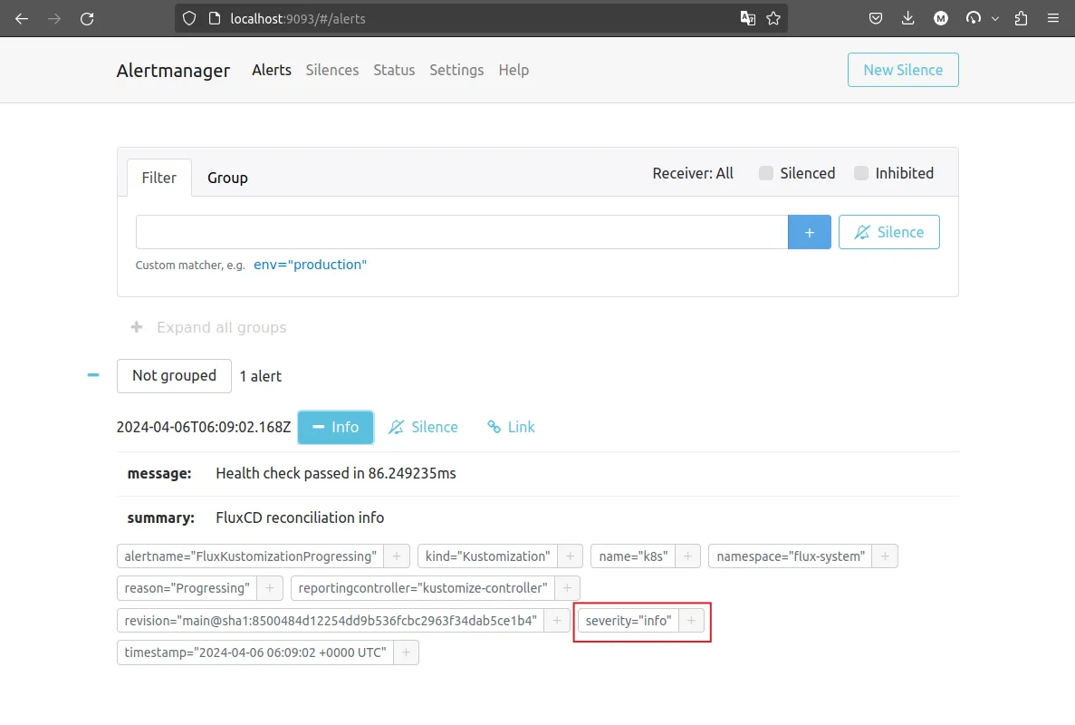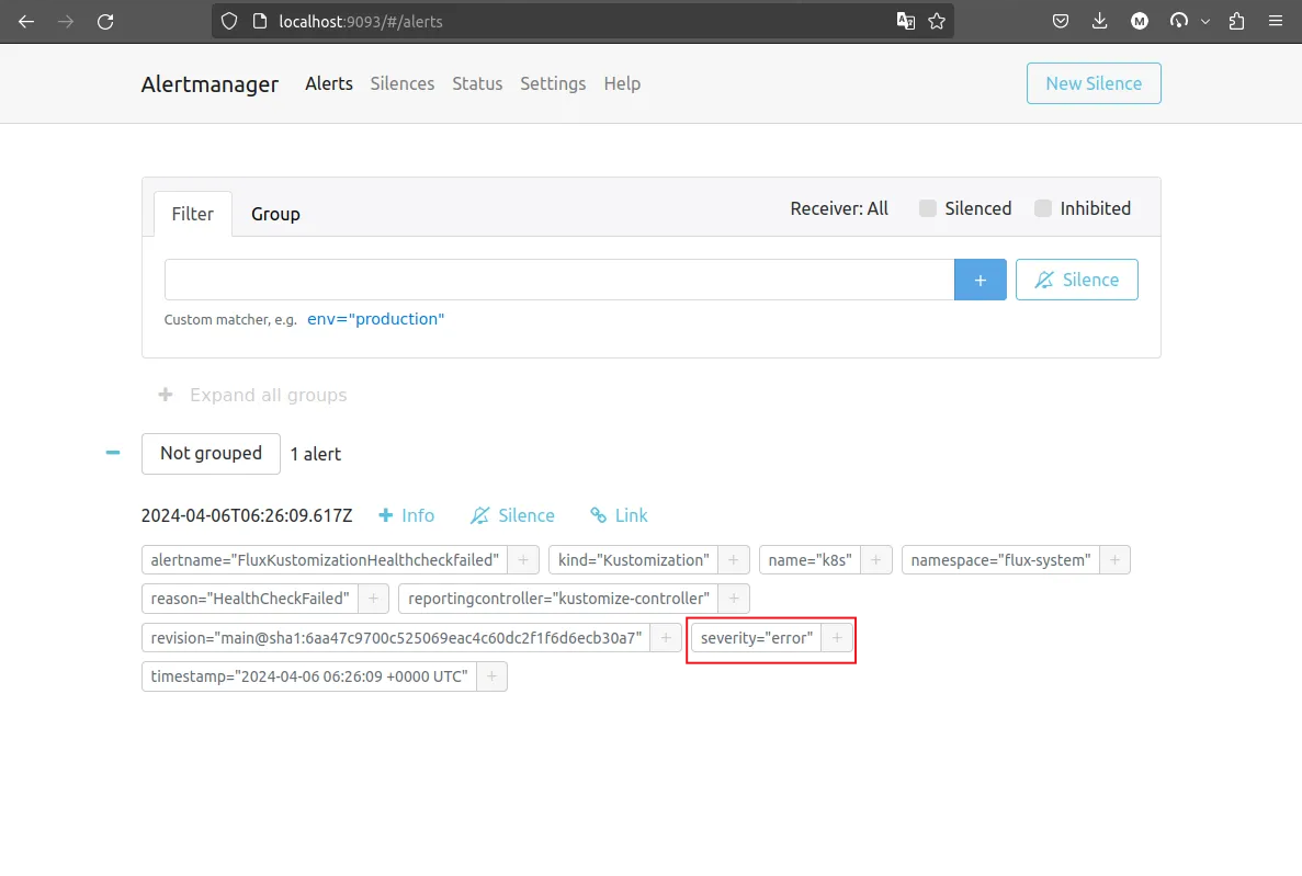 Sure enough, if we open http://localhost:9093, we will see the notification in the Alertmanager UI as seen in the screenshot below.
