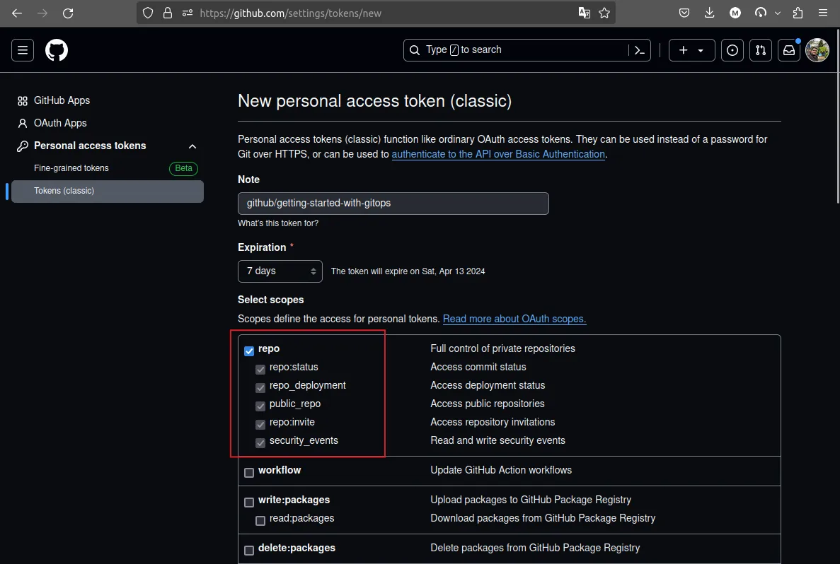 We will need a GitHub Personal Access Token7 with the repo scope. You can see token creation screenshot below: